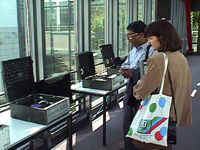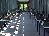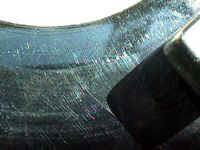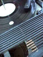 Philip Jeck is an artist of the "Sound Works Exchange". His material is vinyl. He manipulates the records live with his ‘doctored grooves’. Jeck also uses tape loops and a cheap Casio keyboard to create a lo-tech jungle without the breakbeat - a collision of sources rendered unrecognisable through speed changes, short loop lengths and distortion. The progressive degeneration of material through successive re-recordings is celebrated in Jeck's blissed out, textural aesthetic. The medium loops back on itself and enhances its own idiosyncratic qualities. "Its similar to the way I'm working with sound: just textures and landscapes. You're not quite sure what they are and it doesn't matter," says Jeck. "I'm not brilliant at keeping time with tunes or whatever," Jeck continues, outlining his idiosyncratic and primitive approach to sound construction. "With looped records or looped tapes the rhythmic structure looks after itself. I listen to the sound and change the tone controls actually on the record players. And I really only use two effects - an old cheap reverb which goes wrong occasionally and a guitar delay pedal. I just fiddle around with the controls until it sounds right."You see here his installation 'To the bridge' with 29 record-player and timers. (Goethe-Forum May 1998, Munich):