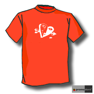 T-Shirt von PROMODORO, Grösse XL, rot mit weissem Druck.Motiv: "Herzchen", ebenfalls ein uraltes ATA TAK Motiv. Es wurde zeitweise sogar als Stempel benutzt. Verschwand in den späten 80ern und wird nun auf dem T-Shirt wiederbelebt.